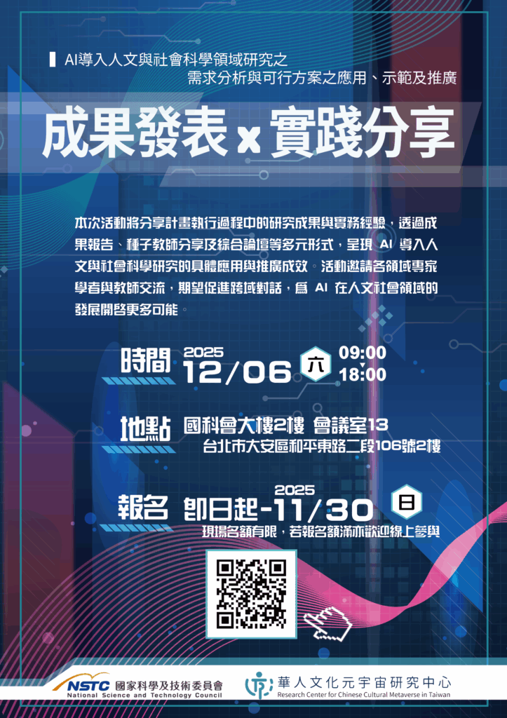 本次活動將分享計畫執行過程中的研究成果與實務經驗,透過成果報告、種子教師分享及綜合論壇等多元形式,呈現 AI 導入人文與社會科學研究的具體應用與推廣成效。活動邀請各領域專家學者與教師交流,期望促進跨域對話,為 AI 在人文社會領域的發展開啟更多可能。